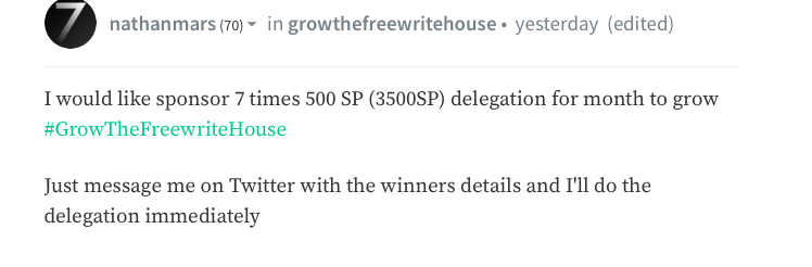 @felt.buzz has not only sponsored the Freewrite House with 20 SBI and supported this effort with a 1500 SP delegation, he also started a contest to grand a 500 SP delegation for one month to a lucky winner!