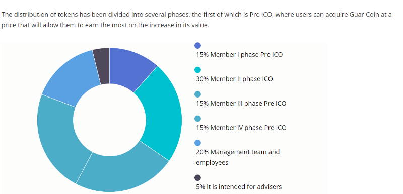 - APRIL 2018 Pre ICO Phase The first 10% of tokens is available for distribution to determine the price of ICO in order to raise funds for the completion of the project. A total of 3.5 billion chips of Guar coins. The estimated proportion of value in the Pre ICO phase is 35 million dollars.