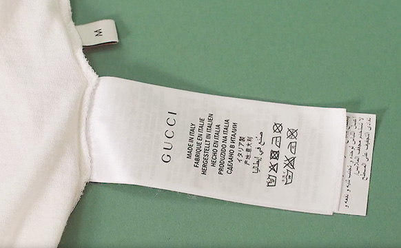 When evaluating a Gucci T-shirt for its authenticity, note that Gucci exclusively uses cotton to create their T-shirts. “While embellishments may be metal, leather, synthetic or a variety of other materials, a Gucci T-shirt that is not made of 100% cotton is a red flag,” notes Wetzbarger.