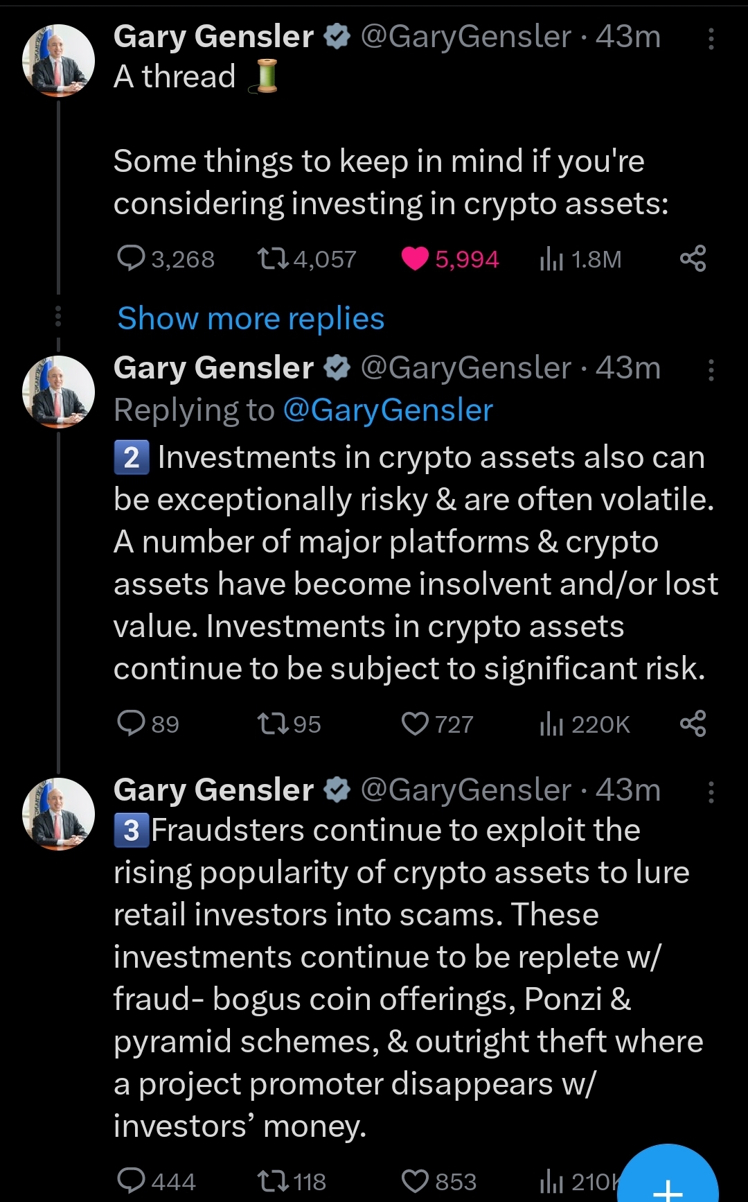 Last night, Gary Gensler, the chairman of the SEC, wrote a thread on X. In a nutshell, he warned when crypto investors are considering crypto investment.