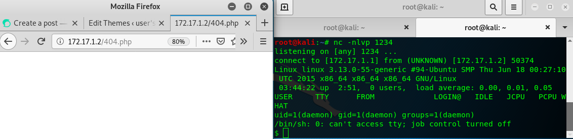 and then visit the page with the shell(in this case 172.17.1.2/404.php). If successful you should see a blank page in the browser and the below information printed to the terminal.