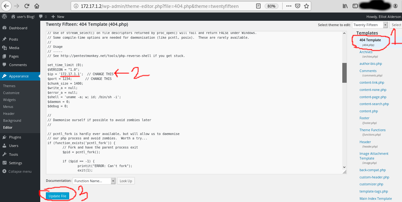 Next we need to edit or create a new page with our php shell in it. It is better to create a new page with the shell in it(with a long, random name). This somewhat prevents others from discovering our malware. However for simplicity we will edit an existing page. We'll choose the page 404.php. Now we need to do the following(all shown in photos below):