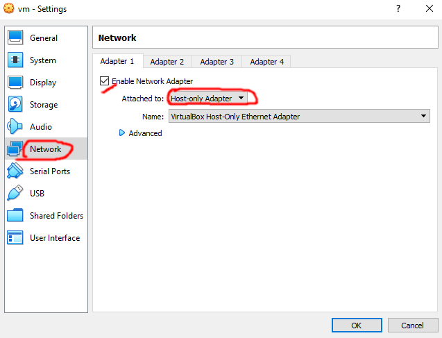Now select the Network option(to the left), make sure it is Enabled and Host-Only is selected as shown.