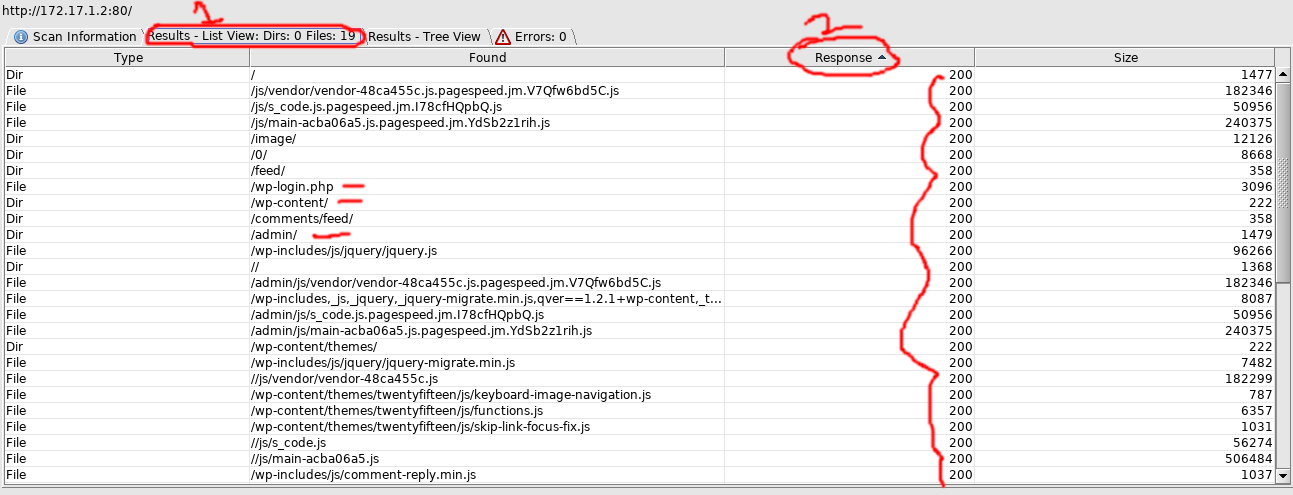 Once the scan has completed you can click on the column labeled "Response" and make it ordered by a 200 response. A 200 response means that the page is valid and accessible(though there can be false positives). In the example below we have found several pages marked by a red dash that could be important.