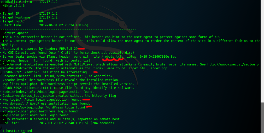 Now that we've checked for open ports along with there versions we need to check for more information. We do this using a program called nikto. Simply go to the terminal and type(making sure to change IP to the one you have):
