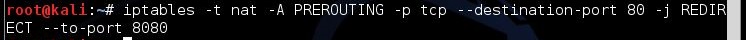 Iptables –t nat –A PREROUTING –p tcp --destination-port 80 –j REDIRECT --to-port 8080 and click “Enter” as showed below: