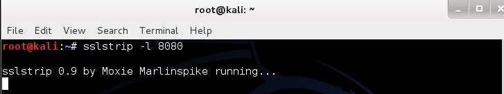 - Now, we open a new terminal and start sslstrip without closing the terminal that is running arpspoof. To start sslstrip type: sslstrip –l 8080 and press “Enter:” as showed below