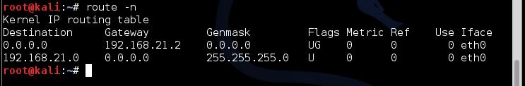 - Next we need to find our gateway ip-address (ip address of router, modem, Wi-Fi) that we are connected to. Type Route –n and click “Enter:” as showed below