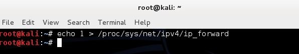- We need to enable ipv4 reading so our computer can route traffic. We type this in terminal: echo “1” > /proc/sys/net/ipv4/ip_forward as showed below and click “Enter:”