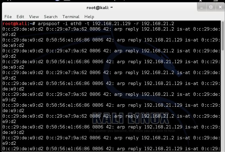 - Next, we need to start ARPspoof to redirect out targets http traffic to our computer by typing arpspoof –i eth0 –t 192.168.21.129 –r 192.168.21.2 as showed below