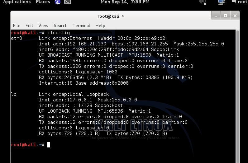 - Open Terminal in kaliLinux; we need to find the name of our network adapter or the interface that we use to connect to the target network: type ifconfig and click “Enter” as showed below;