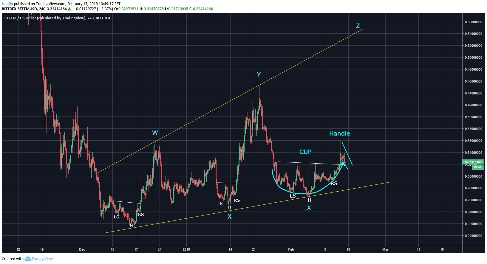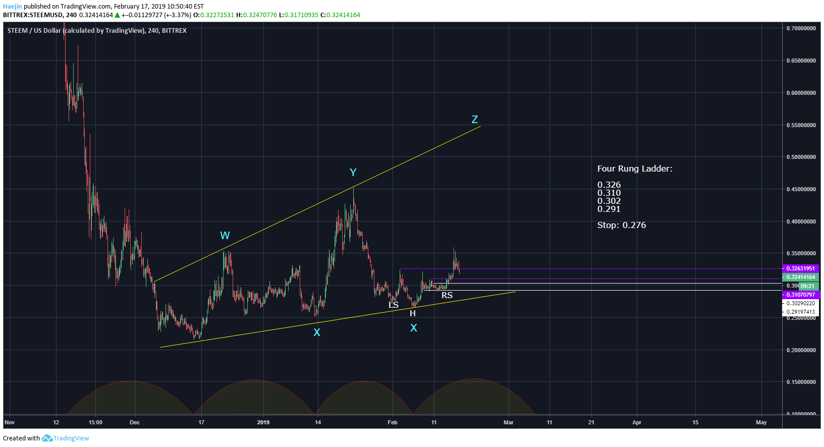 STEEM Trade Update as posted on Bitcoin.Live: As shown in the first chart, two rungs were filled ($0.326 & $0.310) for an average entry price of $0.318. The second chart shows three Inverted H&S fractals that occurred prior to a run up. The current Inverted H&S can also be coupled to a potential Cup & Handle formation. Target price is $0.54; Stop is at $0.27.