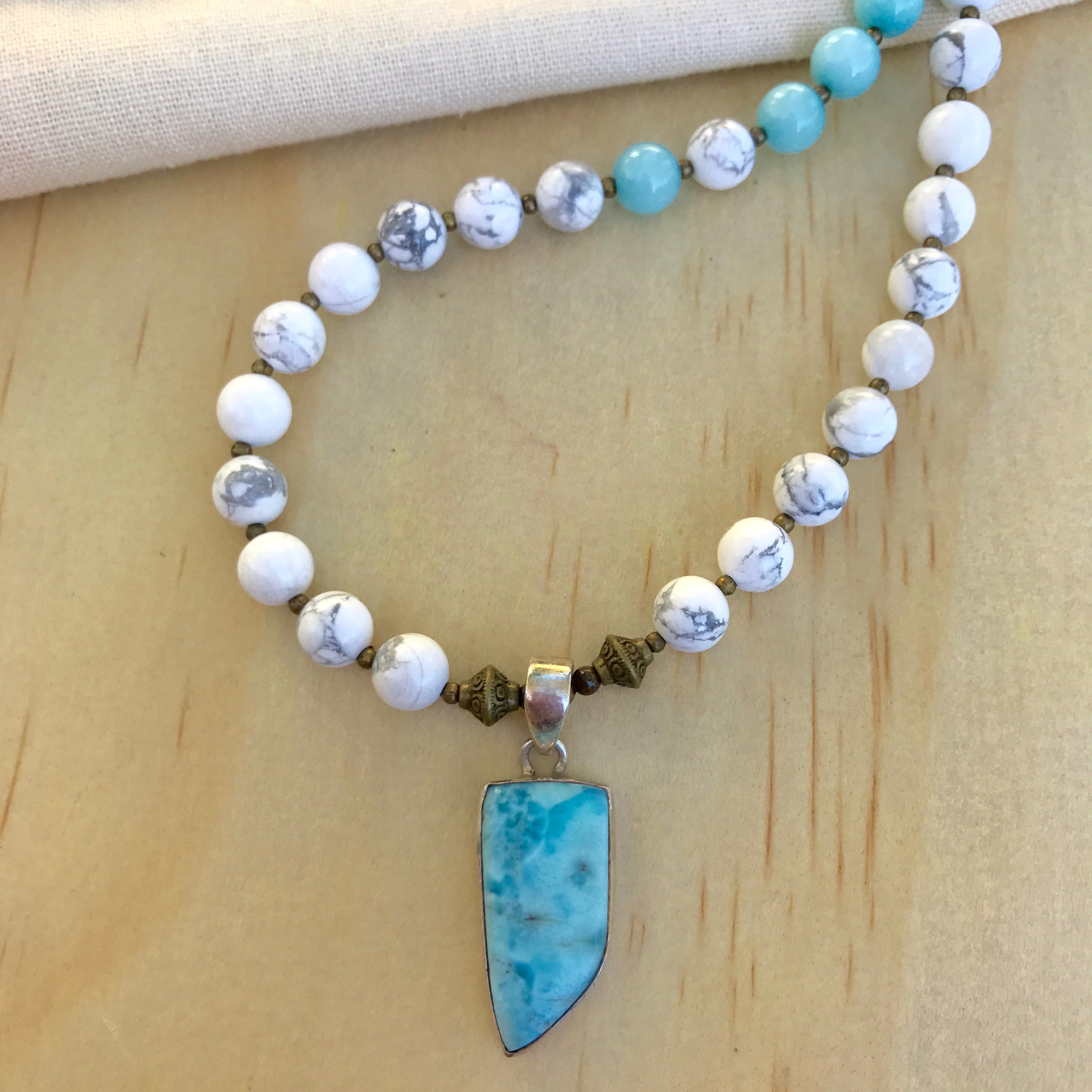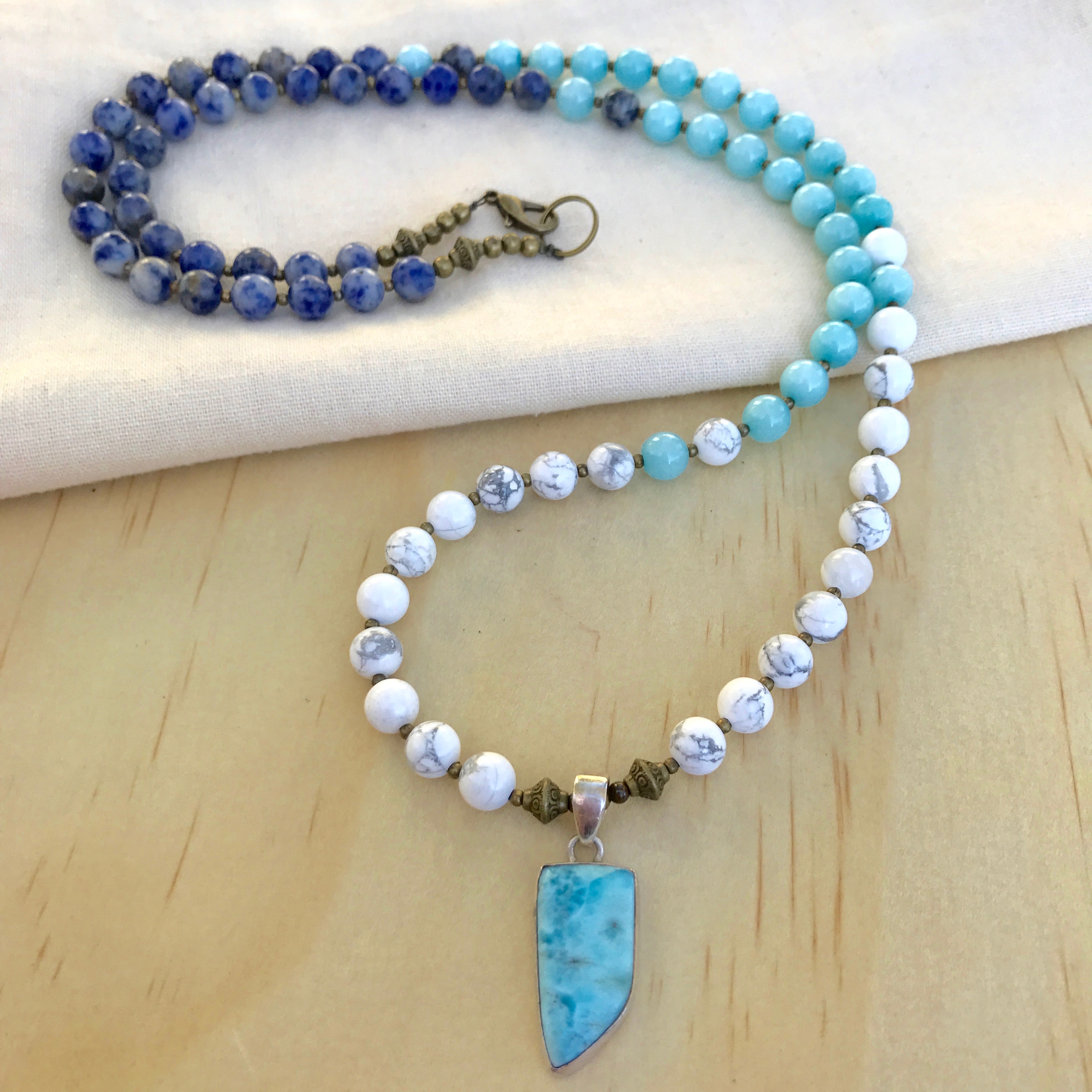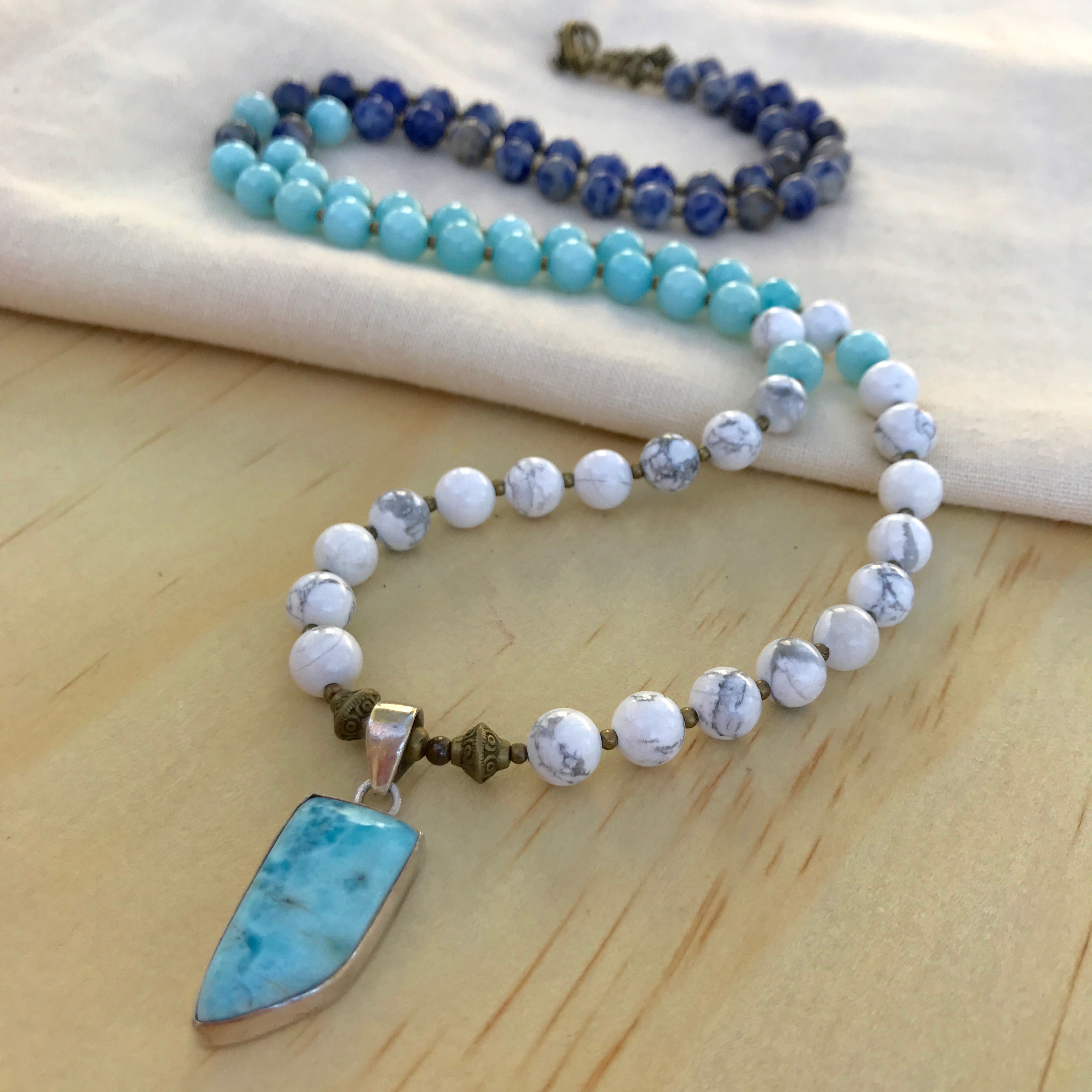 AMAZONITE (The pastel yet bright blue in the centre of the necklace) Soothes the Soul and Calms the Spirit.