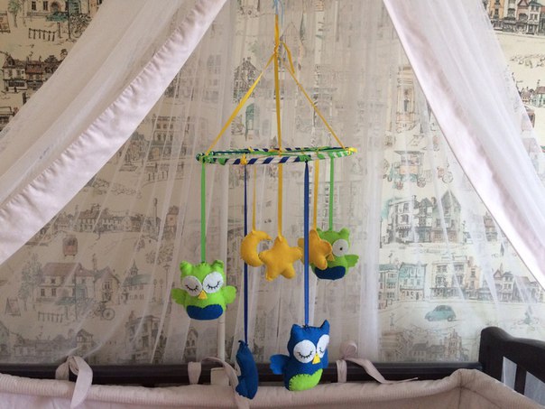 Many beautiful things can be done with their hands. For my son, I made a mobile for the cot. It's very simple. Drew a pattern on paper and transferred It onto the fabric.