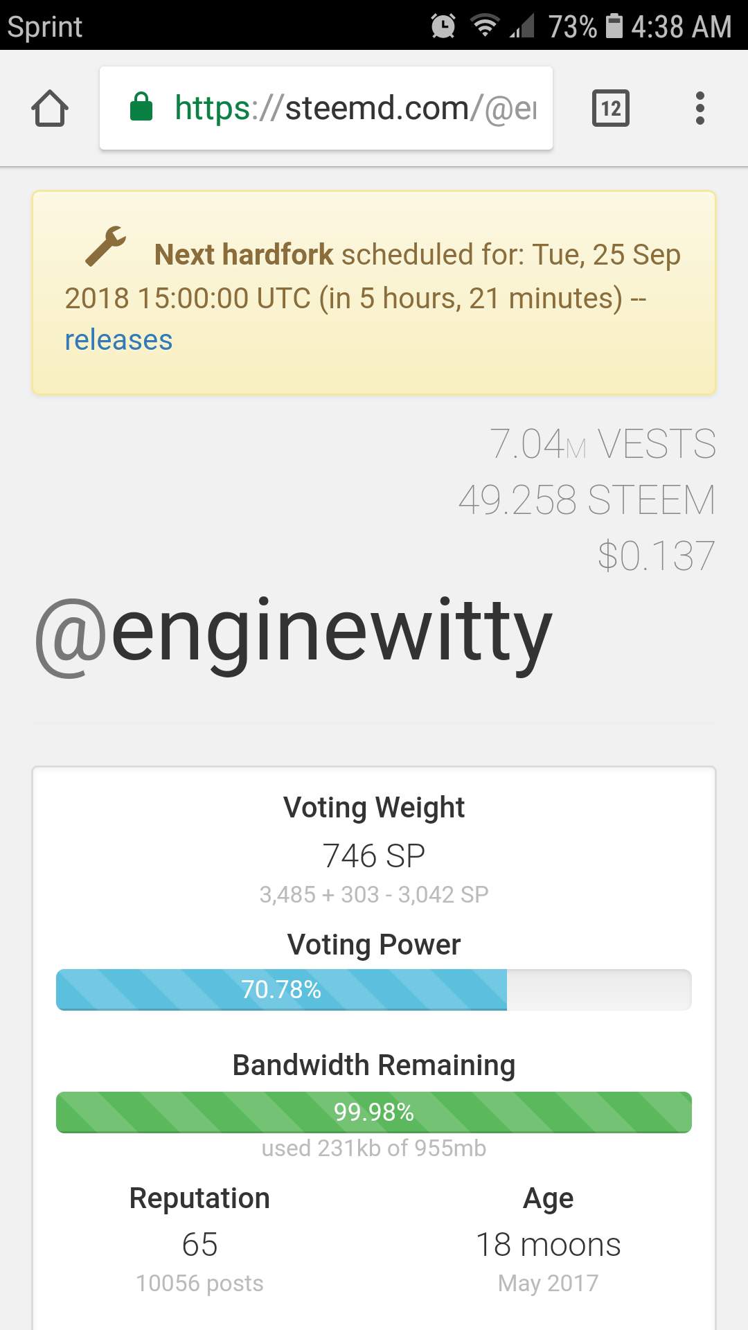 Also says I'm rep 65, but they're rounding up lol! Just a quick shit post as I go over some numbers. That bandwidth you see there will be replaced with 'RC' in a little over 5 hours...maybe I can get a nap in prior. We'll see! Got to be up in two hours tho. STeeM oN my peoples!