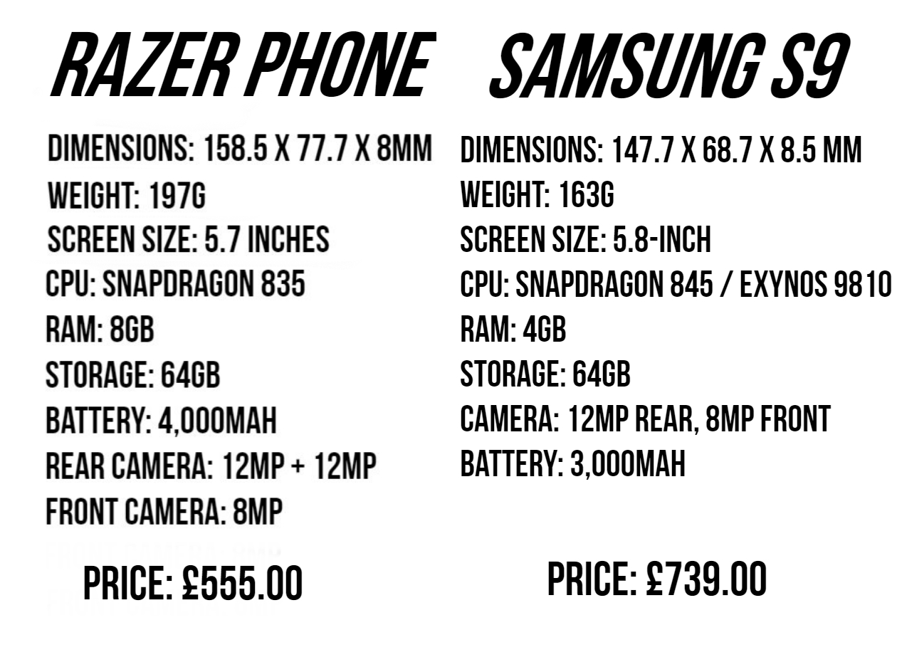 From the Prices above we have compared Samsung's new S9 and the Razer phone side by side. The razer phone is a very powerful little devise and not to be underestimated, is by far some of the best hardware we have seen in a phone. if you want to stand out and impress your friends with a phone that not many people have seen , save abit of money by still having a very powerful phone then the Razer phone is a Grate buy