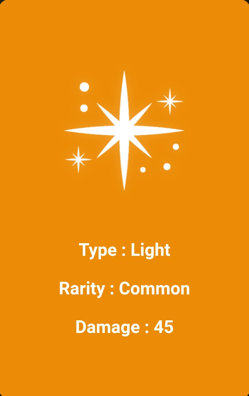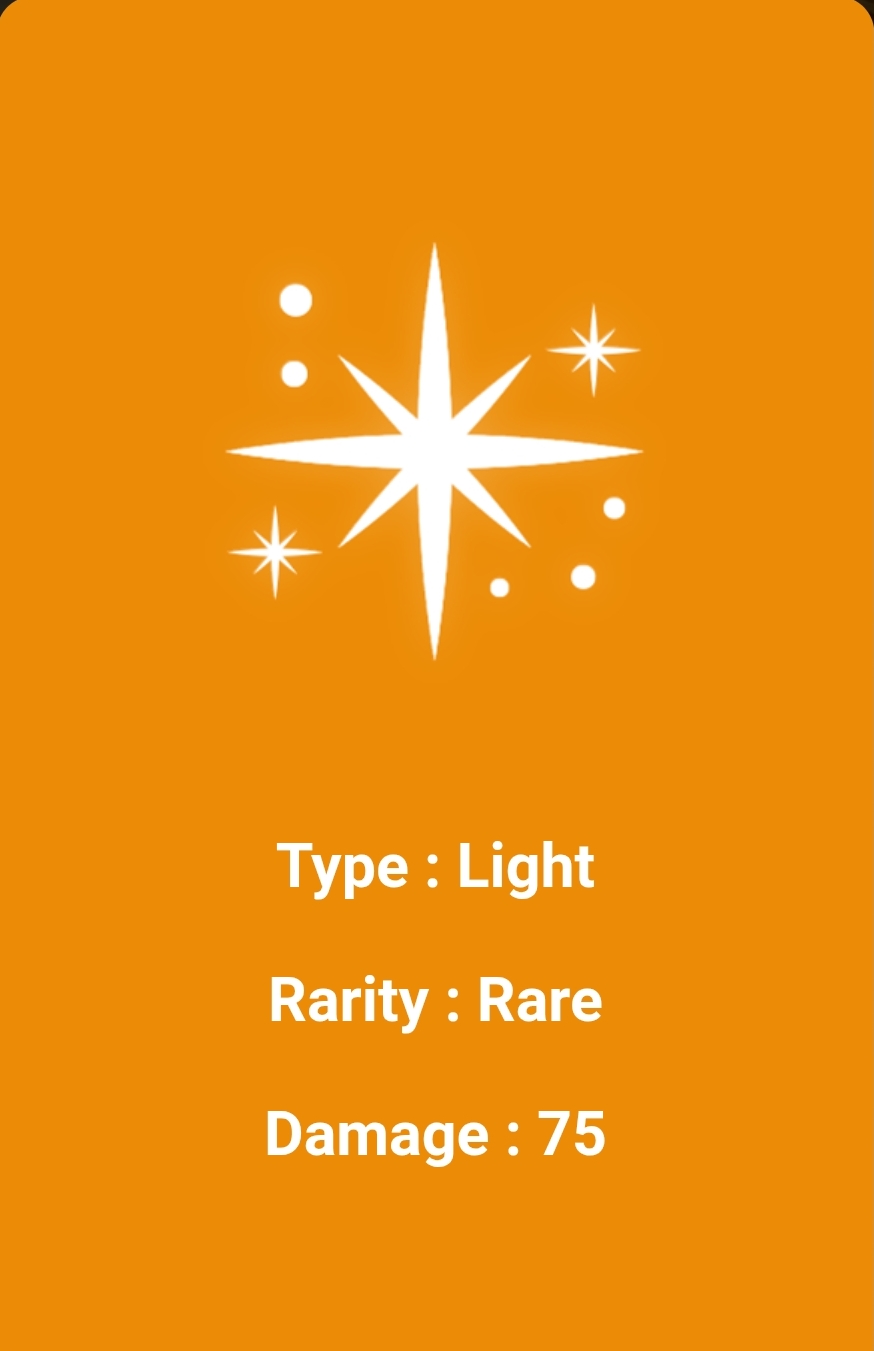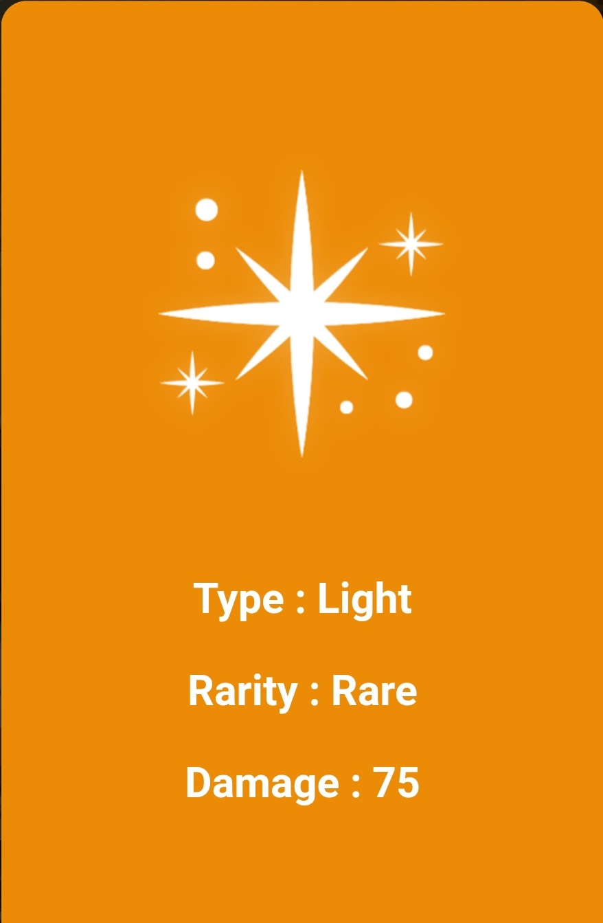 This is the first card you see in orange color. It is a Sunrise card. It has two stars. Its type is Light. Its rate is rare. Its damage is 75. This is a very important card. Its damage is also very high. It is used to deal a lot of damage and it has a lot of fines.