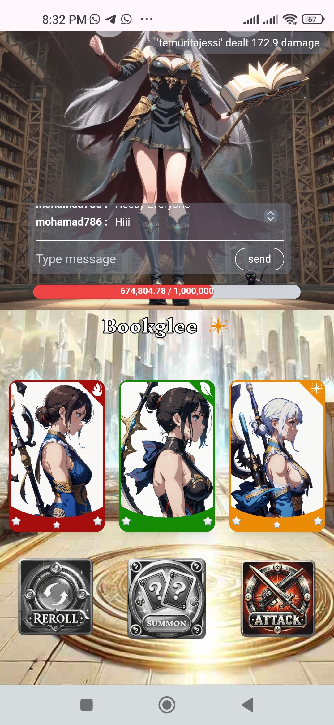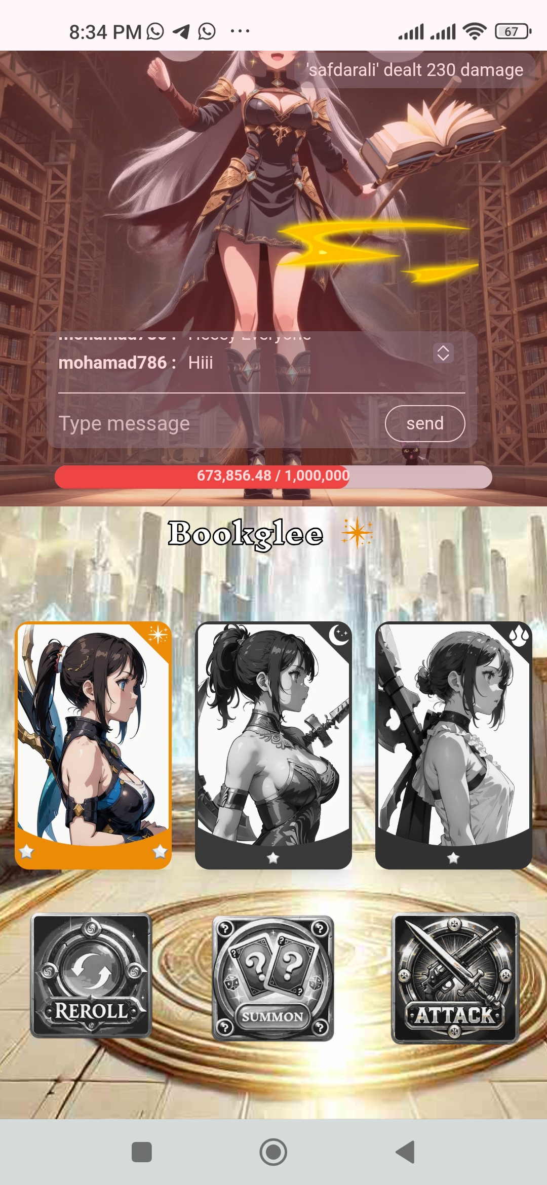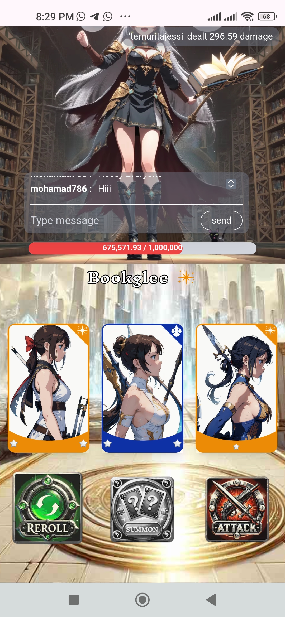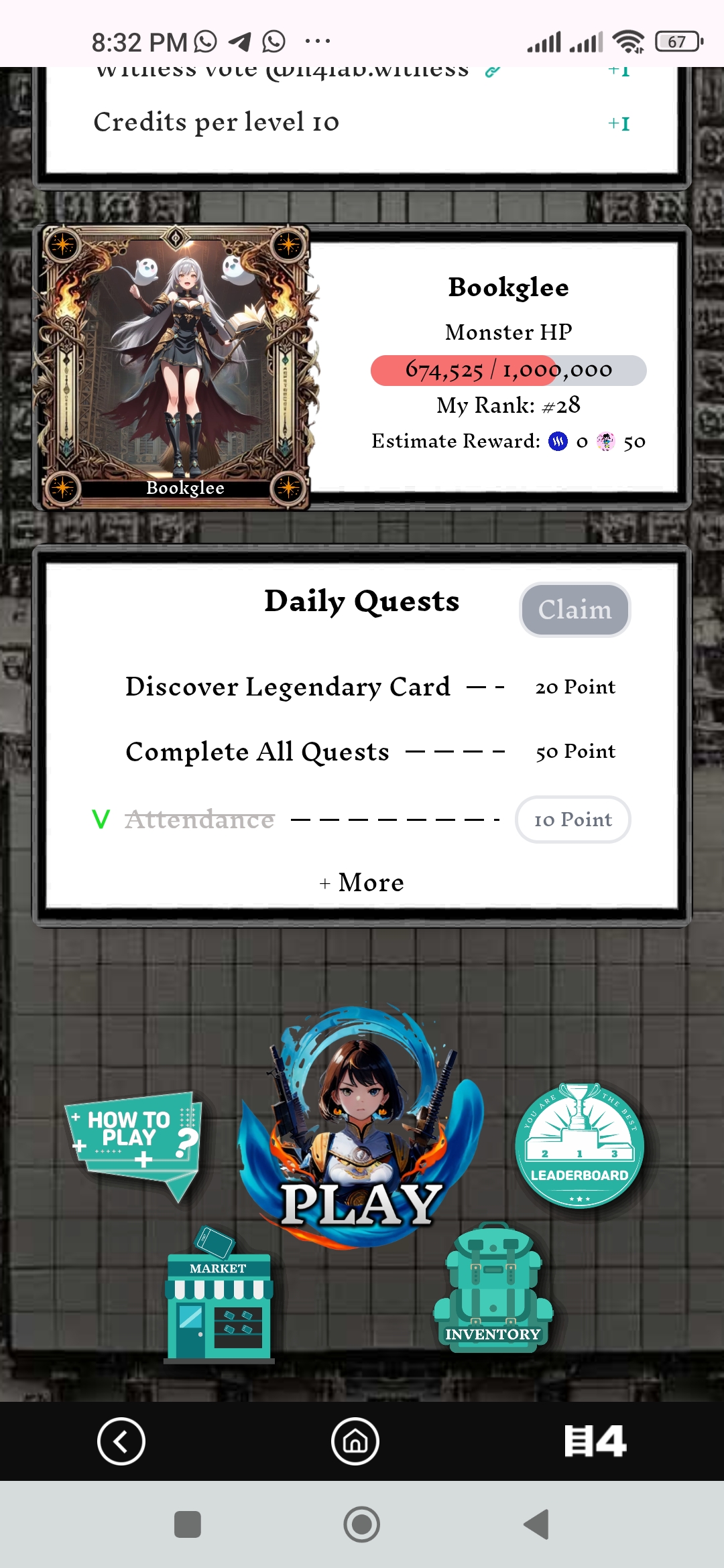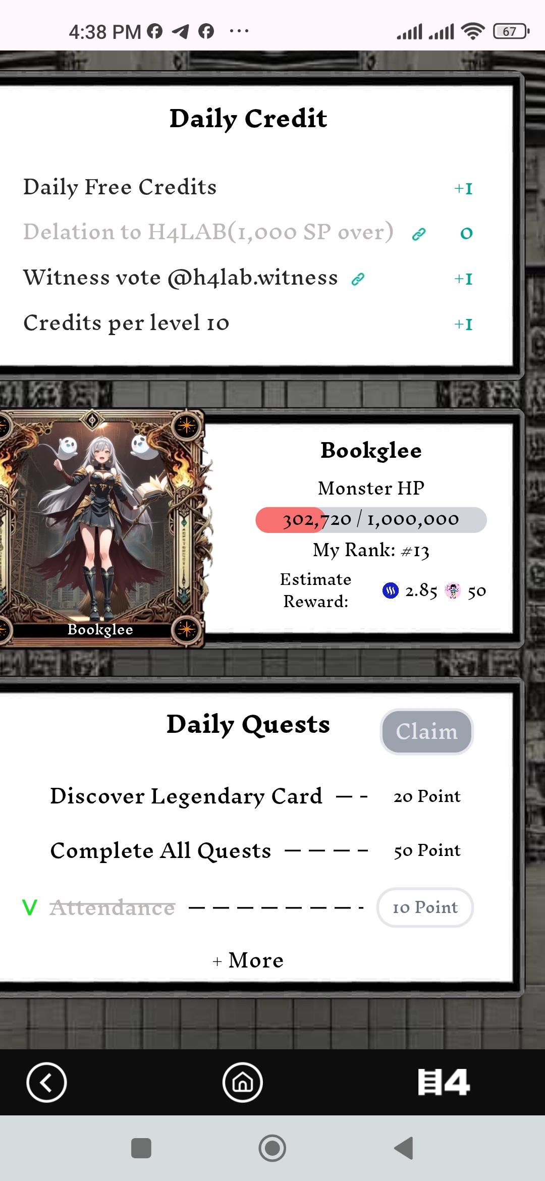 En esta ocasión está despierto un monstruo de luz lo que se hace fácil sumar puntos de oscuridad para hacerle mucho daño. Así que empecé una de esas jugadas diarias y les muestro: Se me concede tres tickets para hacer buenos puntos y en la primera me corresponde tickets de nominación rara y comunes del mismo elemento luz las use para hacer algo de puntos. En la siguiente incursión obtuve dos cartas epicas de luz y Fuego con una carta normal a pesar que no son el elemento que le hace más daño si me suma algo más de puntos. El objetivo diario es lograr las misiones ellas te ayudan a mantener un buen ranking en la tabla de posiciones, pero lamentablemente la legendaria no la obtuve ese día 😢 Compré más tickets para avanzar con este ataque diario pero no más que cartas comunes y raras salieron para sumar puntos un poco bajo, sin embargo hay oportunidad de lograr posiciones en el top 20 y recuperar uno que otros steem invertidos . Adicional se le suma dinamismo y emoción tras la espera de oportunidad de asegurar el artefacto y posicionarse en los primeros puestos . Veremos lo que pueda suceder. Completando mi jugada de hoy he realizado las misiones diarias y recargando puntos con steem aún no he obtenido la legendaria. Esperaré la recarga a ver lo que se viene. Interesante que ya tengo el puesto 13 por los momentos. Así que invito a unirse al juego a mis amigos @tahispadron @pandora2010 @miguelito80 @wianbear @jesuito15 @tolvi7u7 y si alguien desea usar mi referido , les comparto: https://hari-raid.h4lab.com/?ref=ternuritajessi .
