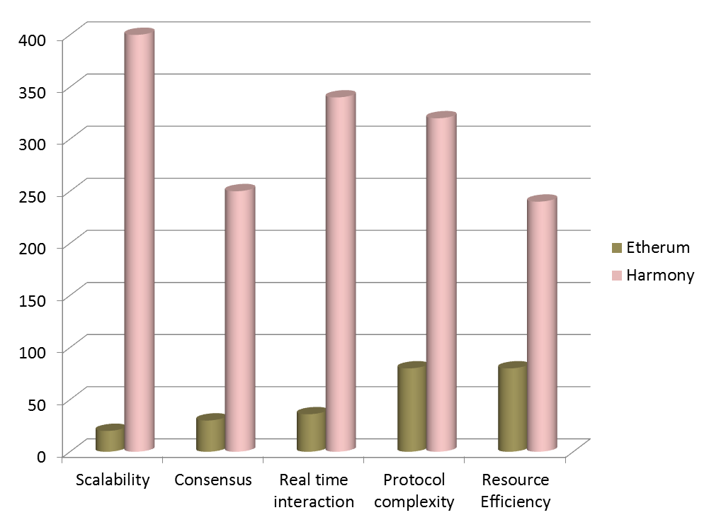 The scaling capacity of ETH chain is 20 tps, whereas the reported testnet scalability of Harmony chain is 118000, and the potential scalability is even more in Harmony.