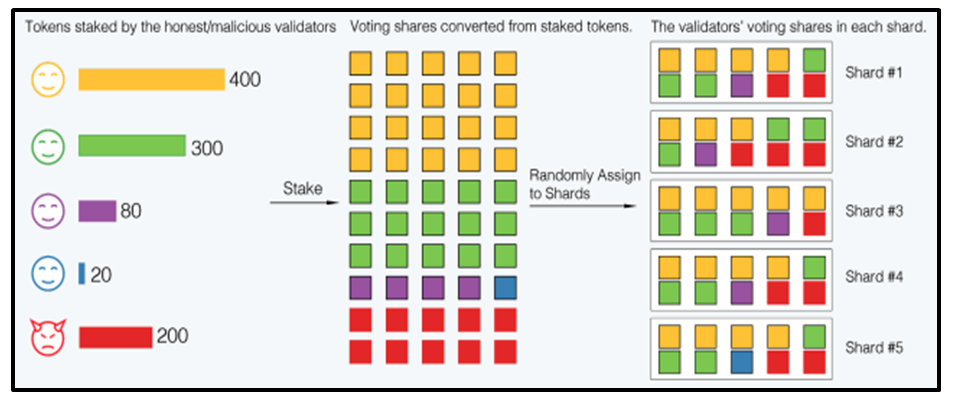 - A constant number of voting shares from all the shards are then randomly redistributed to the other half of the shards which have less than "median of the total voting shares".