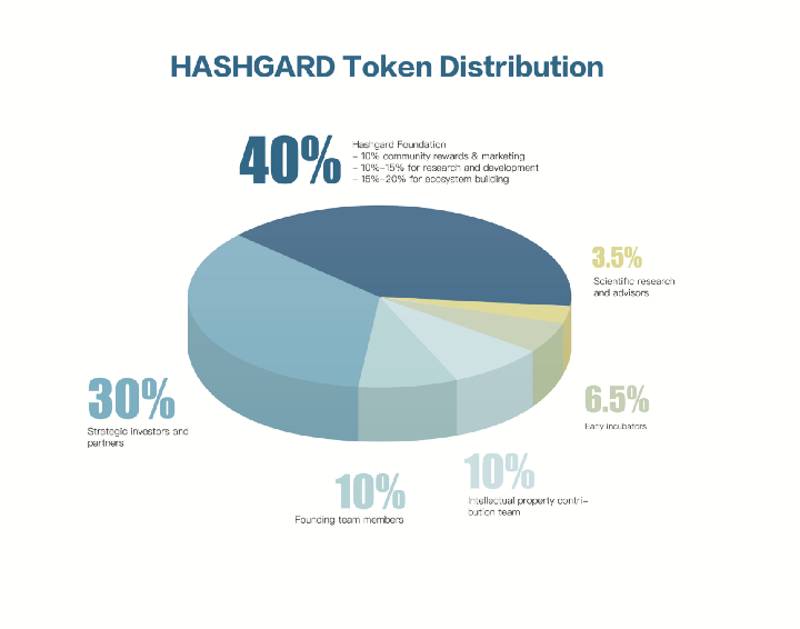 Hashgard выпускает 100 миллиардов нативных встроенных крипто-токенов, названных “GARD”, которые распределяются следующим образом: