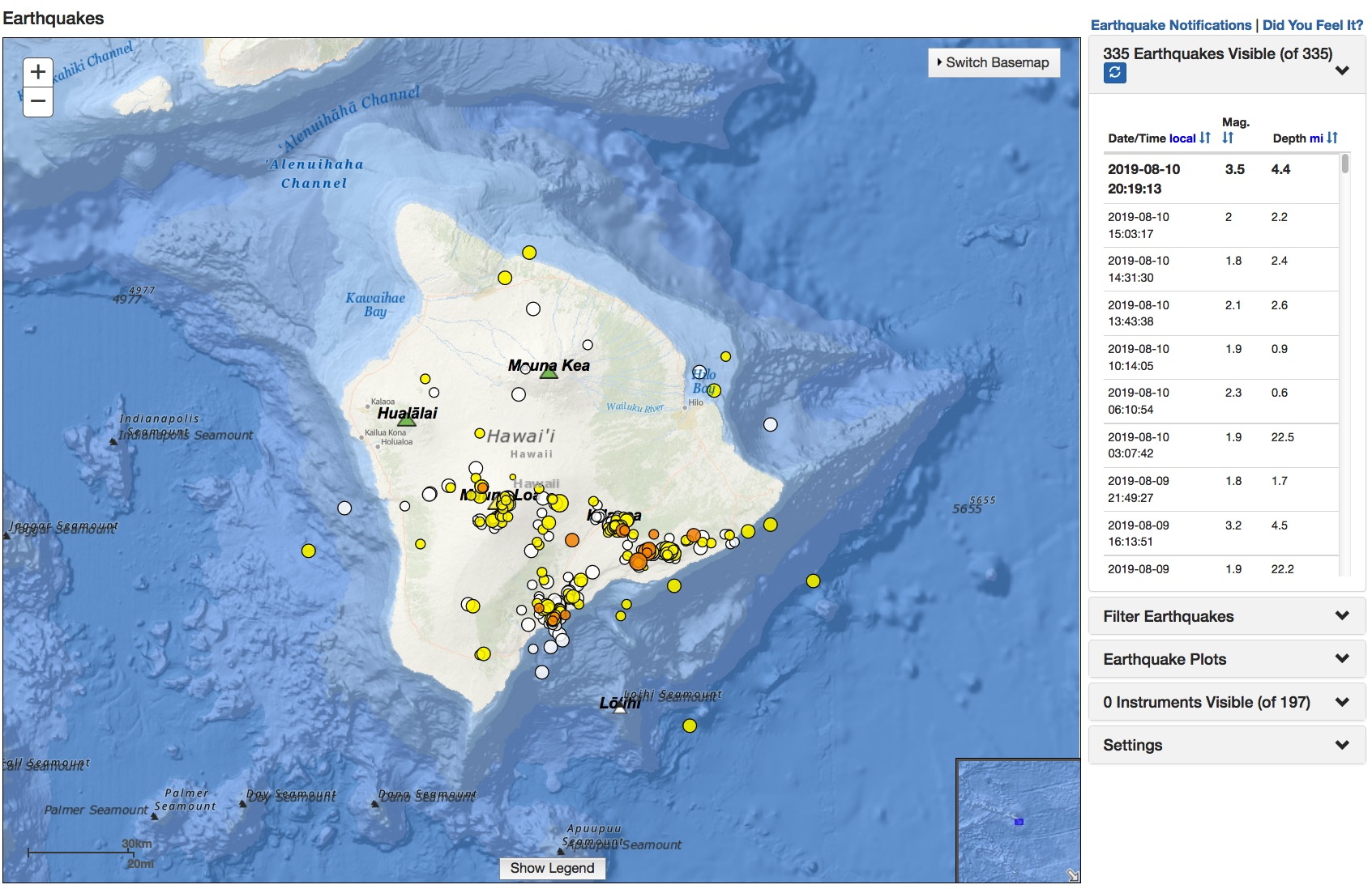 HVO Earthquake Map of Hawai'i island August 10th, 2019