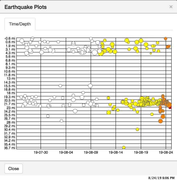 The increase in earthquakes continues. The alleged depth of the majority of these quakes is at the bottom of Mauna Loa at around 17 km below ocean level. This plot that is also from the HVO web site shows the distribution: