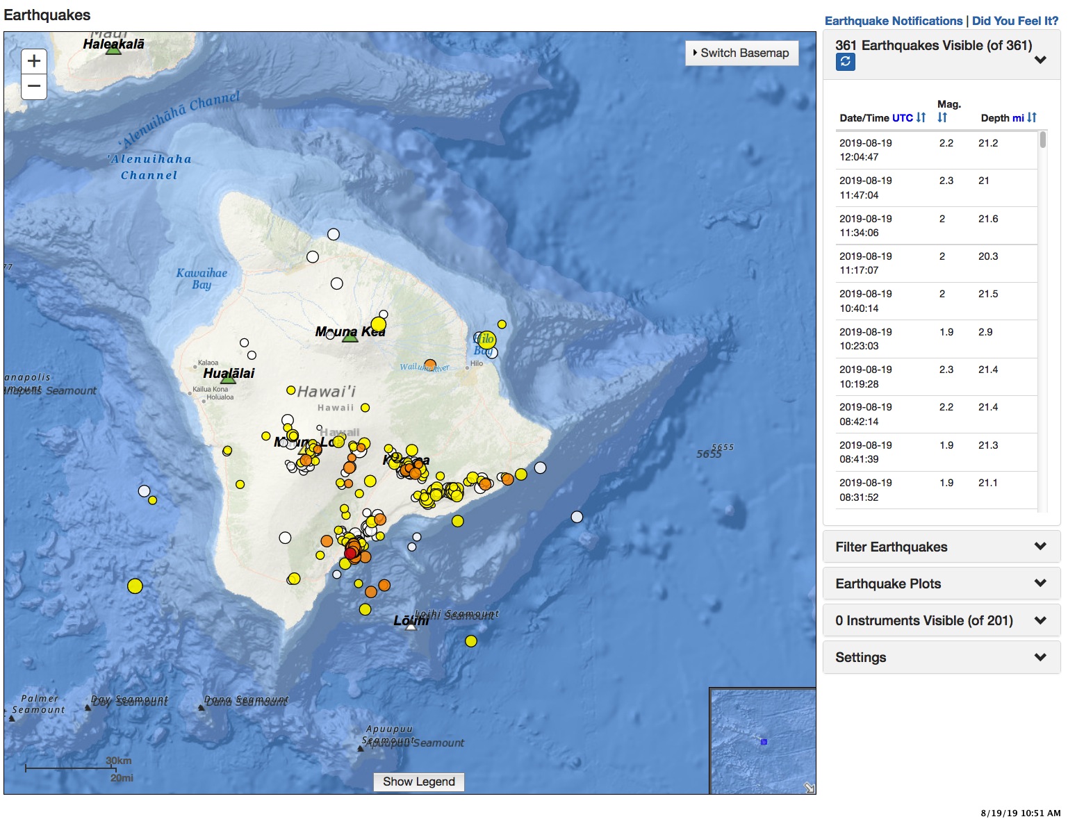 HVO Earthquake Map of Hawai'i island August 19th, 2019