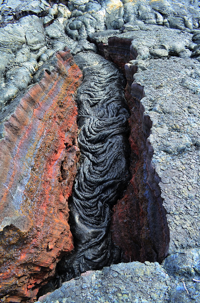 You can see the layering in this crack, that was created when fresh Lava was injected below, breaking the existing layer and pushing it upwards. Another image from the Hawai'ian Volcanoes Observatory shows a larger area where the layering is visible: