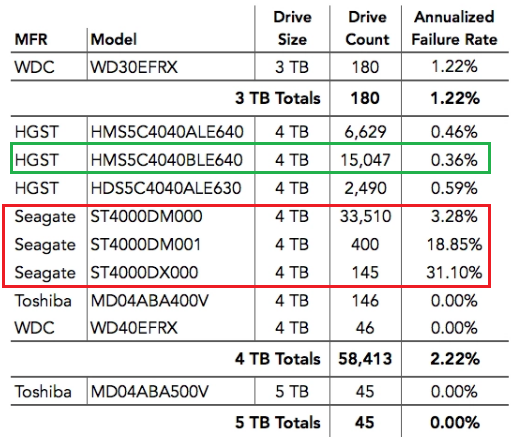 Si debemos tomar nota, Seagate encabeza los discos que tienen mas problemas, por ejemplo HGST tiene la mitad de discos de Seagate pero las fallas son muchísimo menores.