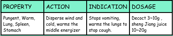 Ginger is usually used as supplementary herb that can be combined with other pungent warm exterior releasing herbs which then promotes sweating which has an exterior releasing effect, this effect is used to disperse wind and cold.