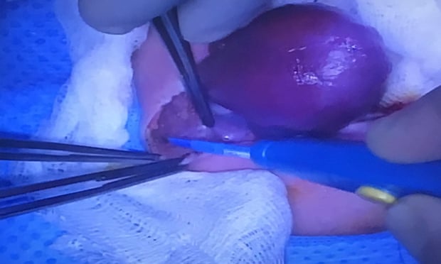 A baby girl born with her heart outside her body is believed to be the first in the UK to survive with the extremely rare condition after undergoing three operations, the first within an hour of her birth.