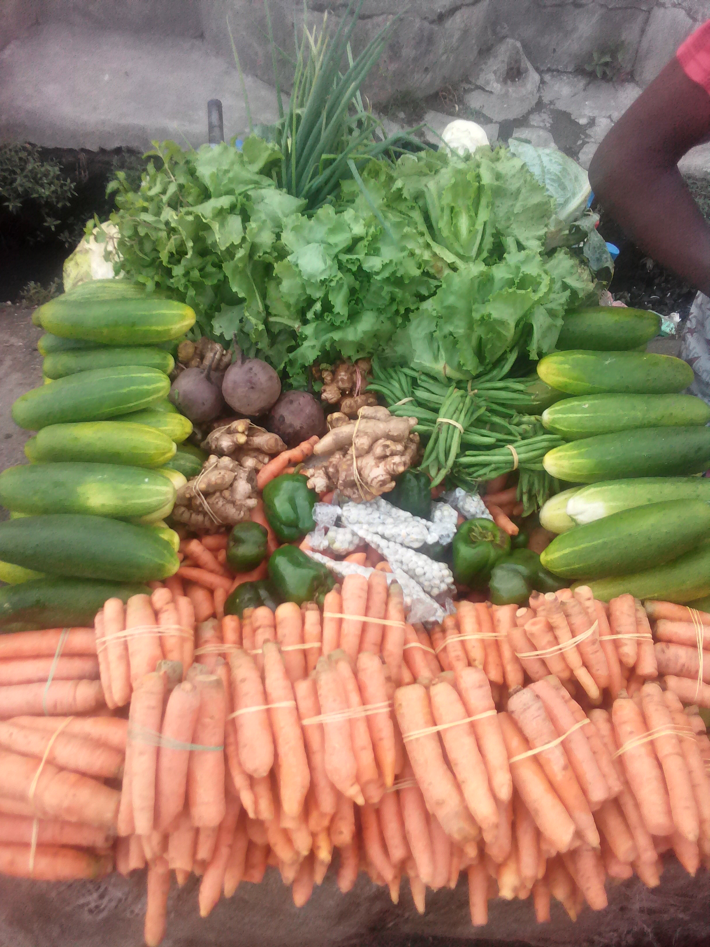 It comprises of different well arranged fruits and vegetables which are carrots, grean pepper, green beans , lettuce , onions , garlic, ginger,green salad & cucumber..