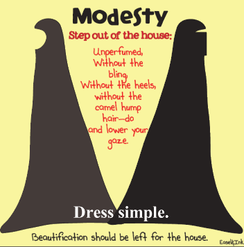 Example of Modesty: May God have mercy on a woman who, having lost her child, went to fetch him from a group of people, his face veiled. "Look at this woman says one of them, she inquires of her child the veiled face!". Having heard her, she answered him: "Man, it is better to lose my child than to lose my modesty!" But modesty does not prevent the Muslim from saying what is true, to learn, to exhort to do good and to condemn evil.