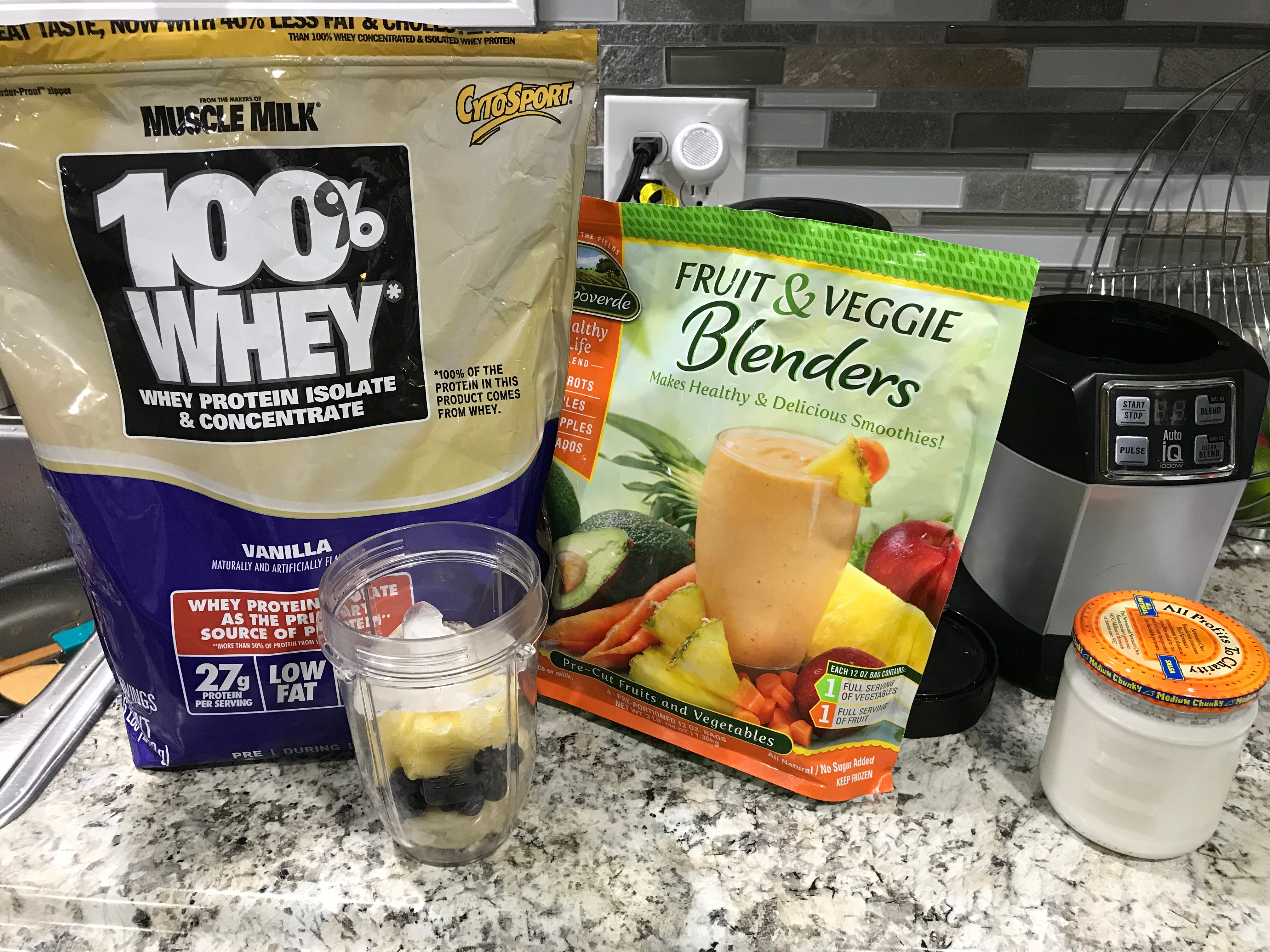 As you can see above from left to right I use vanilla protein powder, a nutri ninja system which comes with to go cups, frozen fruit and vegetables, and that jar contains kefir. I will talk more about kefir later.