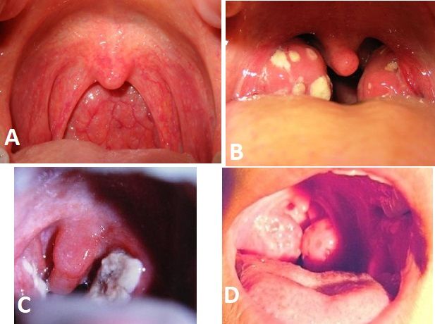 Fig.-Different types of tonsillitis;A-superficial tonsillitis, it involves superficial mucosal layer and tonsils are not enlarged;B-follicular type, it shows pus filled crypts seen as yellow dots;C-membraneous type,shows membrane formed by coalescence of follicles;D-parenchymatous type,tonsils are greatly enlarged