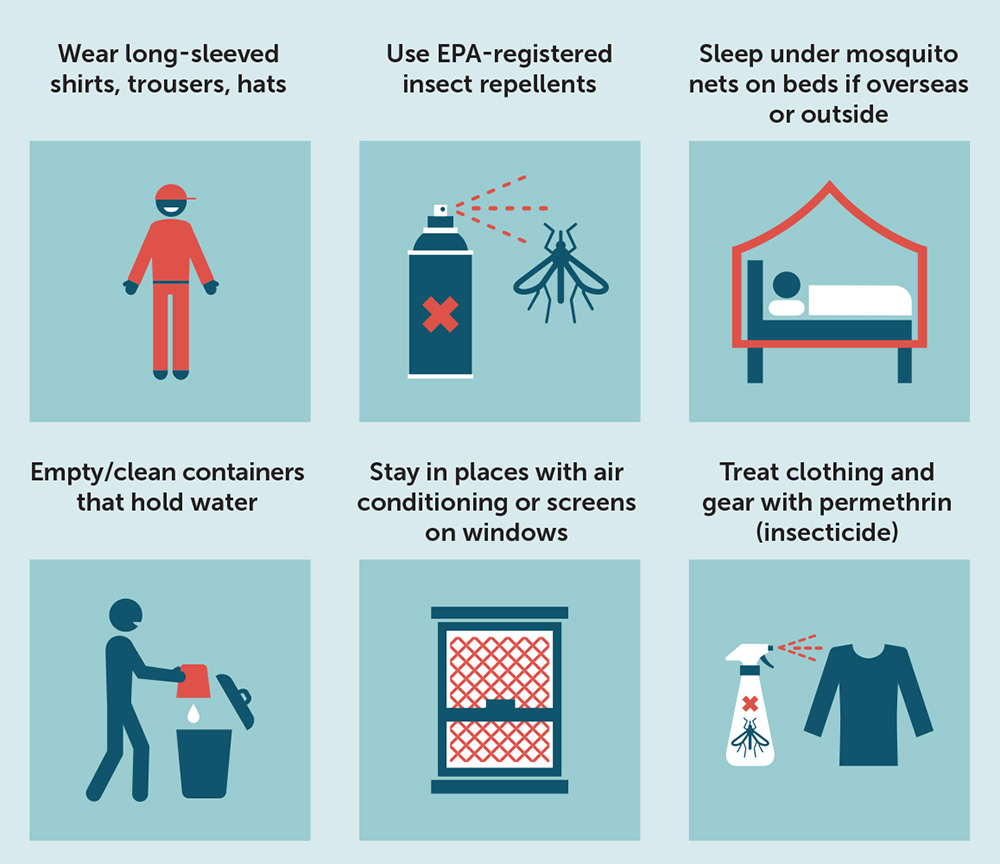 - Use screens on windows and doors, and get rid of standing water in tires, buckets, planters, and flowerpots, as mosquitoes lay eggs near water.