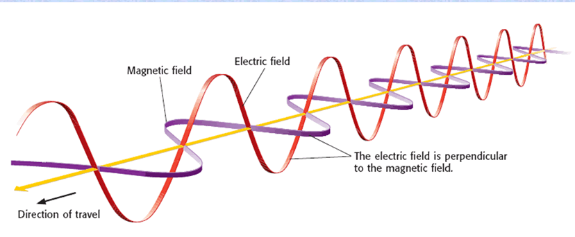 EMF’s stand for electromagnetic fields, and EMRs stand for electromagnetic radiation. Both terms can be described as wavelengths of energy comprised of an electric and magnetic field. We often refer to them as "electromagnetic frequencies" as well. These fields move together perpendicularly, forming a wave-like shape like this: