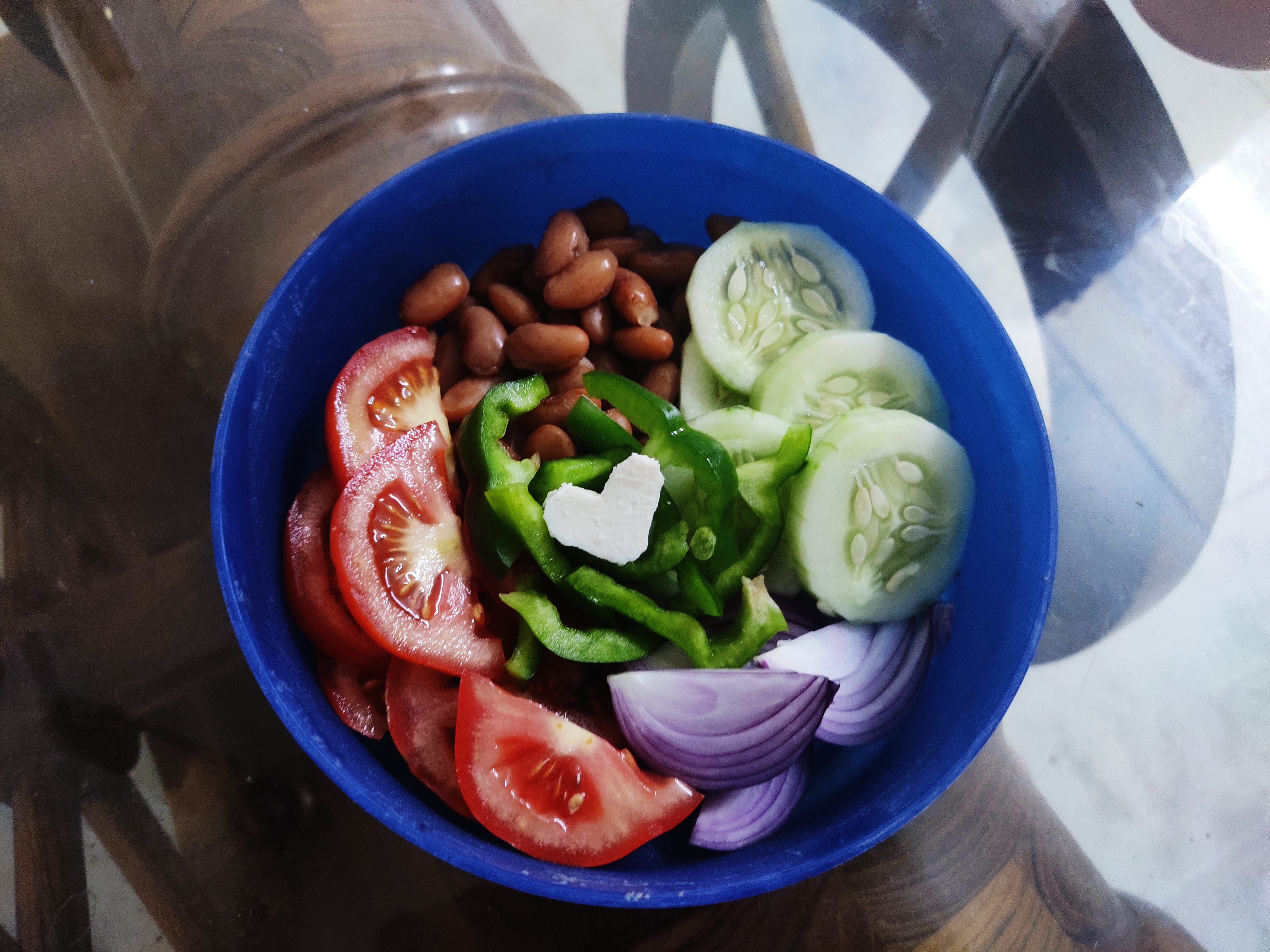 I just added chopped tomato, onion, capsicum, one cup boiled kidney beans, paneer, cucumber and that'a it.