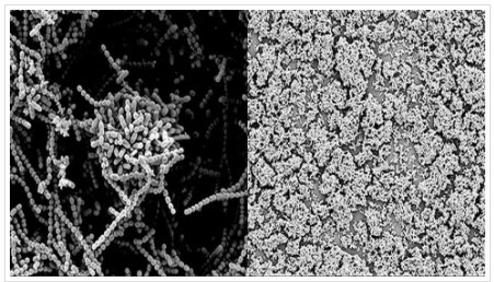 The close-up image on the left illustrates how streptococci usually coalesce together to form a protective biofilm. The photo in the right part shows how the biofilm breaks down when the streptococcal culture touches the carbohydrates of breast milk and thus destroys their resistance to the effects of antibacterial agents.