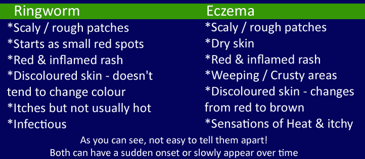 Whilst ringworm forms these same circular discoloured patches it tends to be less symptomatic. It may itch but not the often frantic and wild itching of eczema, and there is no sensation of heat with ringworm. Ringworm can cause scaly skin but again it’s not usually as severe as the dryness I see in chronic eczema cases. Whilst eczema can change from red to an almost dirty colour, ringworm doesn’t tend to change colour.