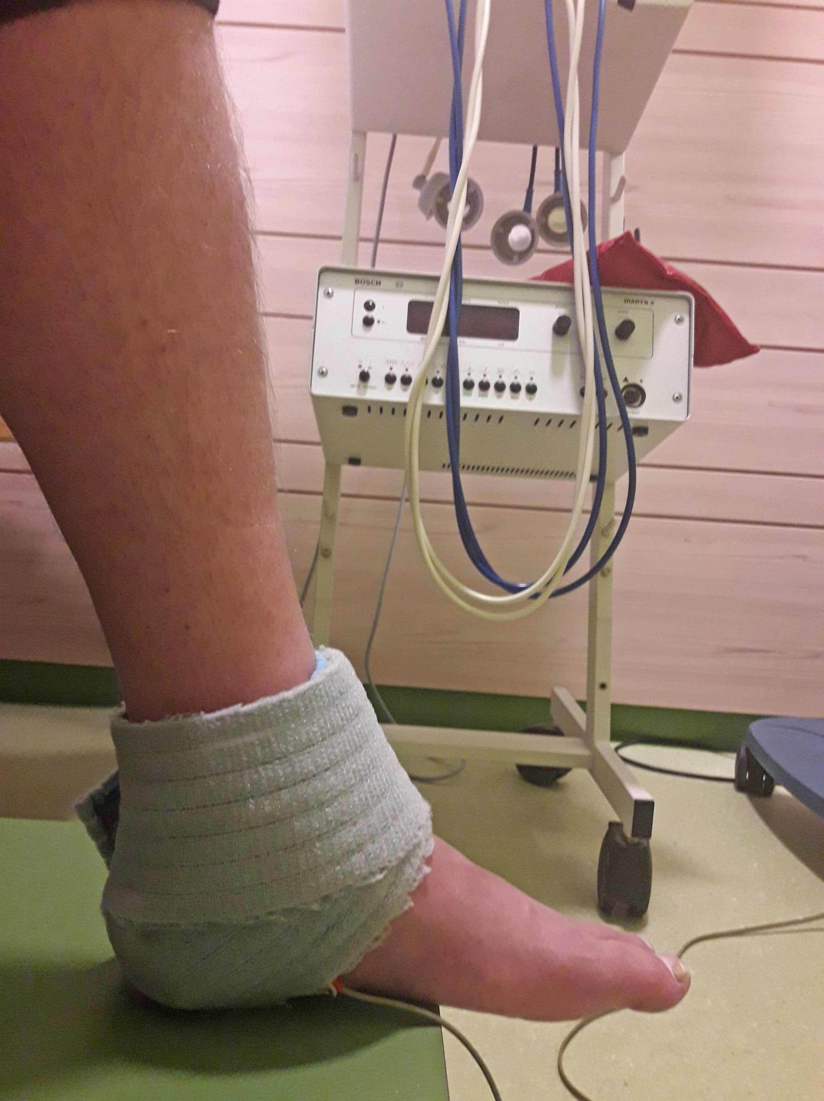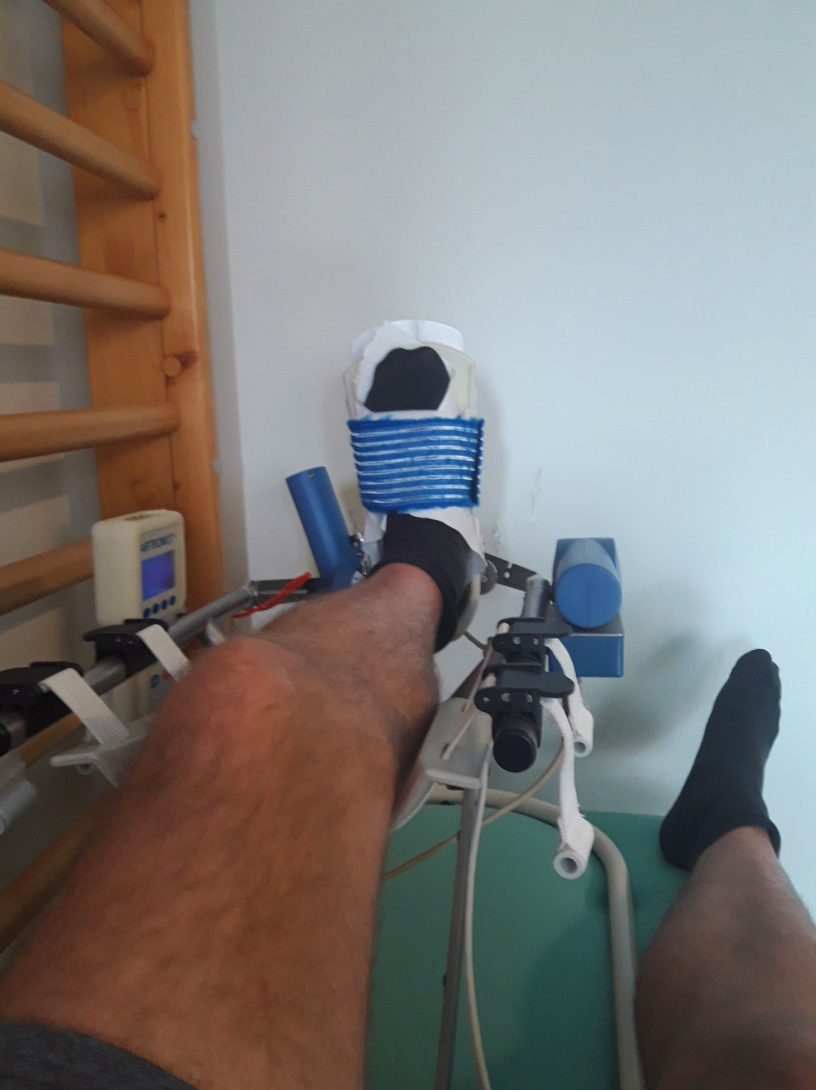 Kinetec is a stylish, automated machine that stretches your injured foot to the bearable limits. Your leg is clamped in the apparatus, with set-in maximum angles of your movements and then the machine ensures accurate and even repeats of these movements. All you have to do is lie there and meditate.