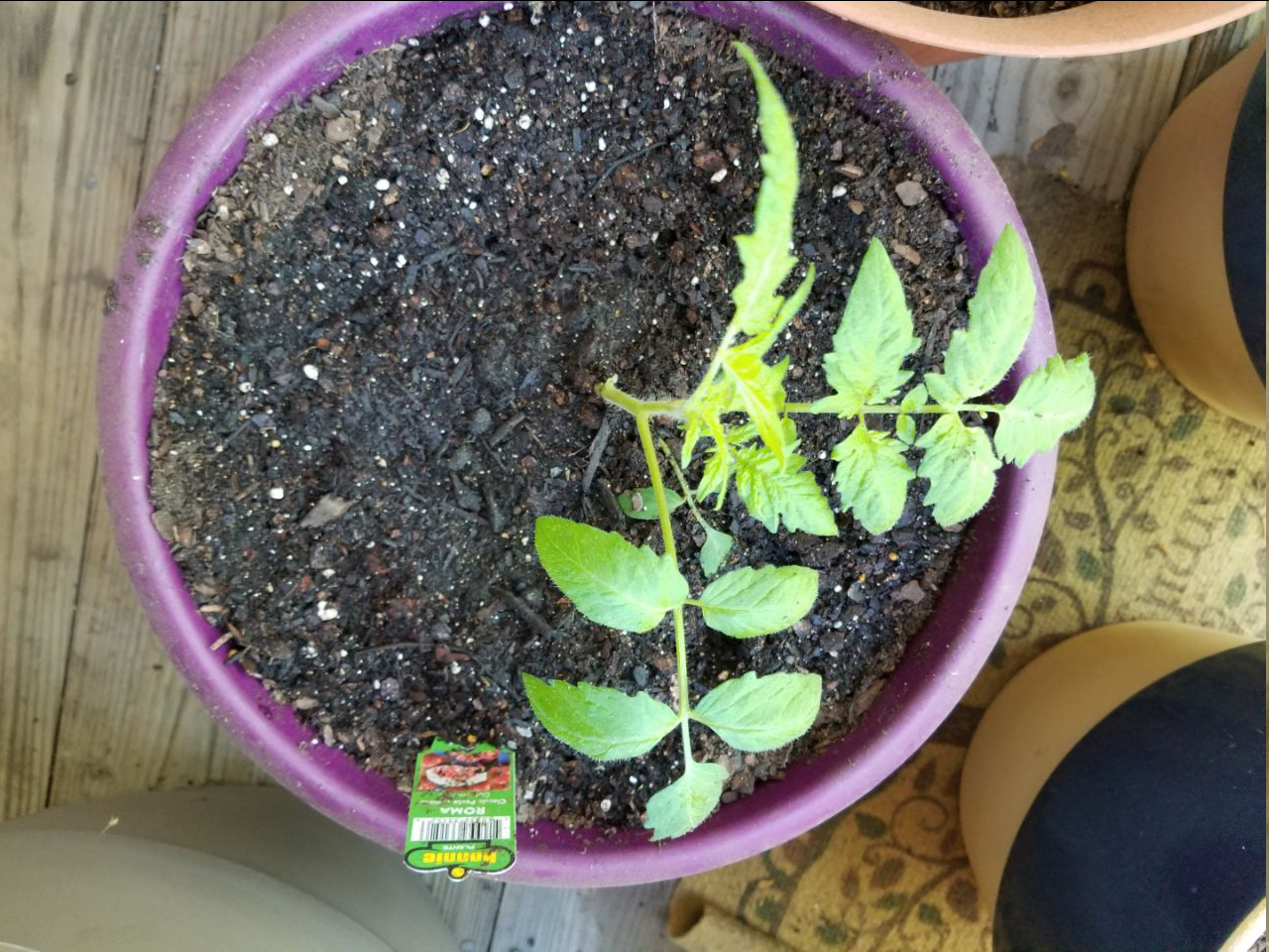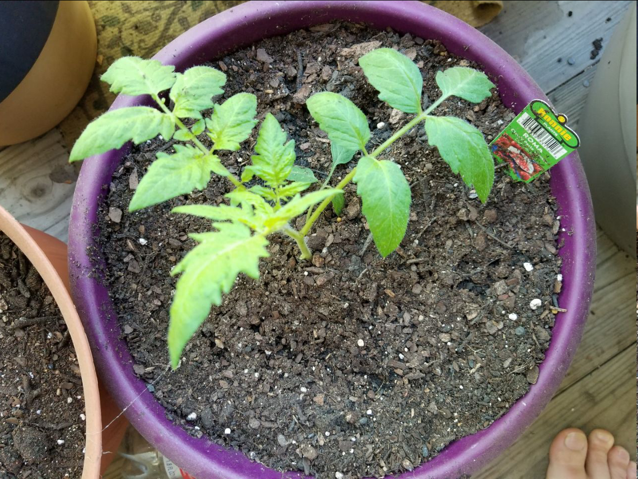 These tomato plants were bought like this but we transplanted them into the bigger containers you see them in. They were purchased at Lowes 4x for $10.