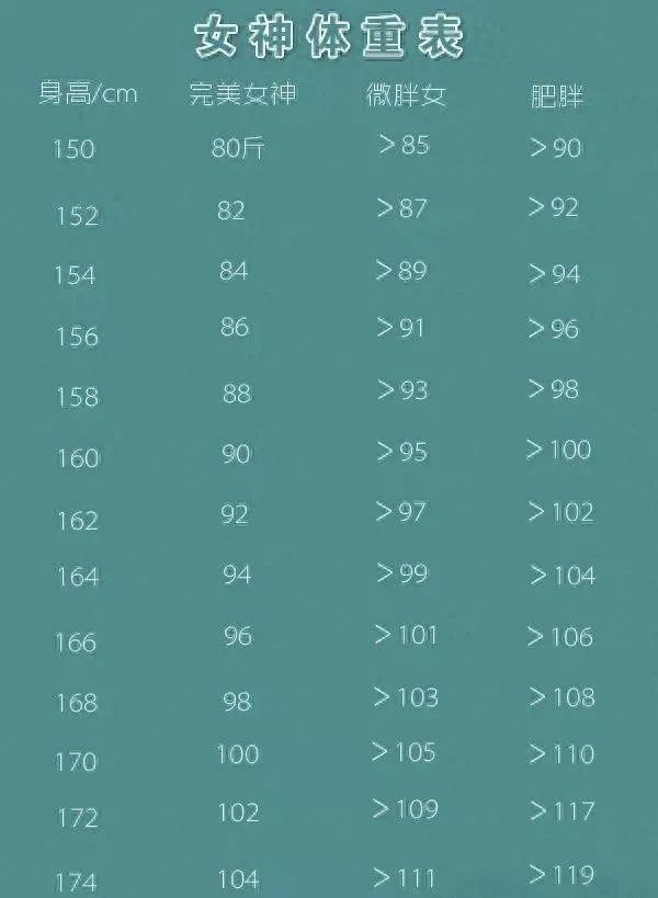 对于女神体重表,注意是女神不是女性,这要求太高了,身高170体重要求100,说实话这个有点太瘦了,而且不一定好看,根据大风就能吹跑。