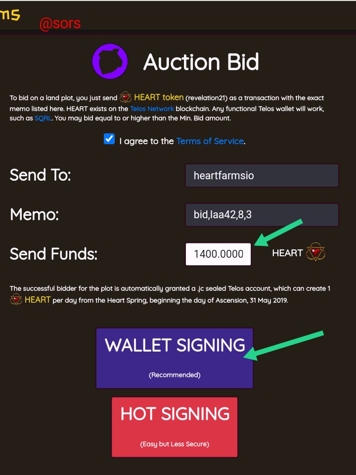 At the heart farm website i log in with my telos account private key then i clicked "Angel Passage new" that's where i bid for the land and the land I bid for need 1,400 heart for minimum bid