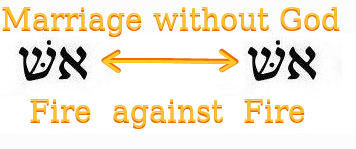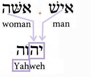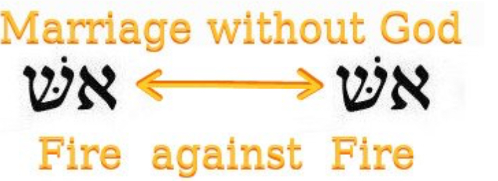 Here we see the words for man and woman, which have God's Name built right into them. Yud built into the man and hey built into the woman. If you remove God's name from the couple, you have neither man nor woman, but only fire vs. fire. Selfish desires, fights, and divorce.