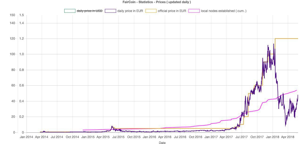 Over time, FairCoin has maintained a stable price for around 3 years, going up in price as the market price moved up. However since Bitcoin’s price was going up, it also took FairCoin’s price as well. When Bitcoin’s price crashed, it took our market price down as well, and our stable price couldn’t move back down for that would destroy trust within the ecosystem. A stable price can move up, but can’t move back down. The current stable and official price within the FairCoop ecosystem is 1 Fair = 1.2 Euros.