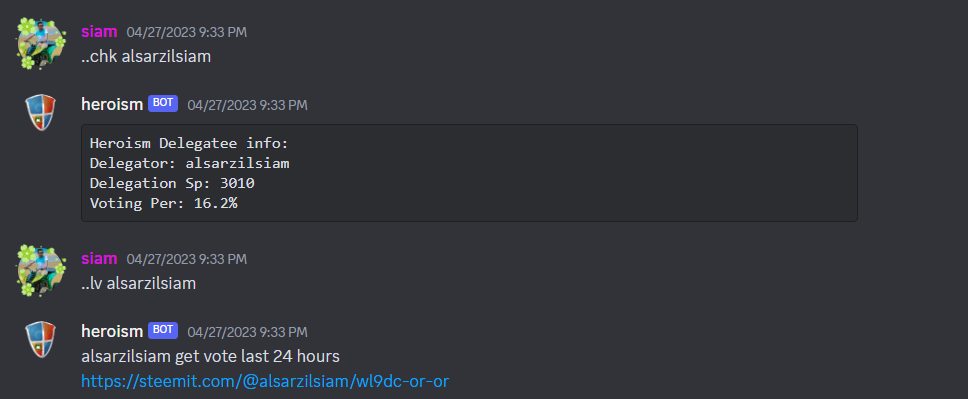Now come to the details about the heroism discord bot. Mainly, the heroism bot is designed for the betterment of heroism delegators. With the heroism bot, delegators can check their delegation stats, increase or decrease delegation easily, and check their last vote status with some simple commands.