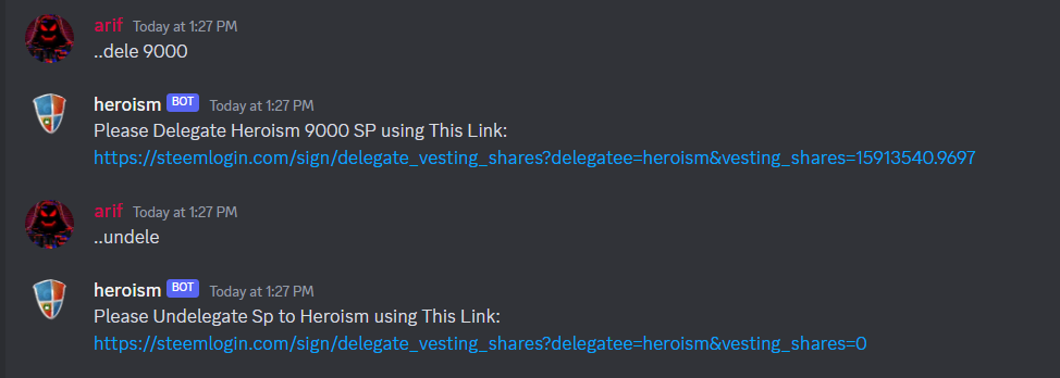 User can use these command to Heroism discord server delegation tools channel.