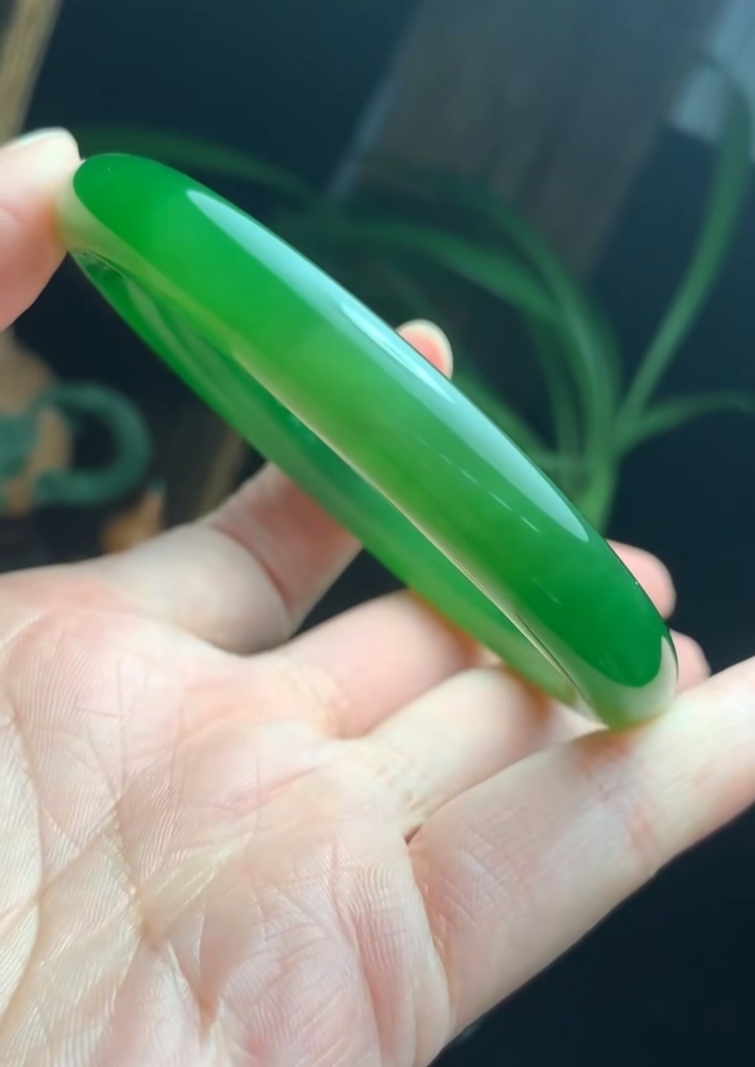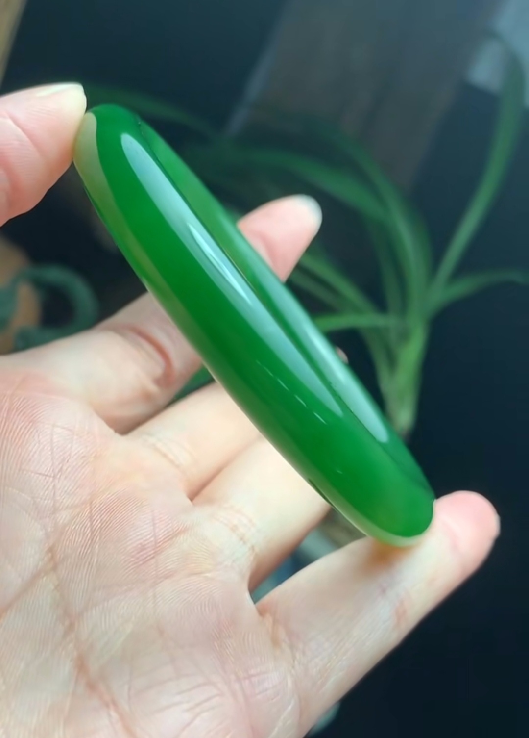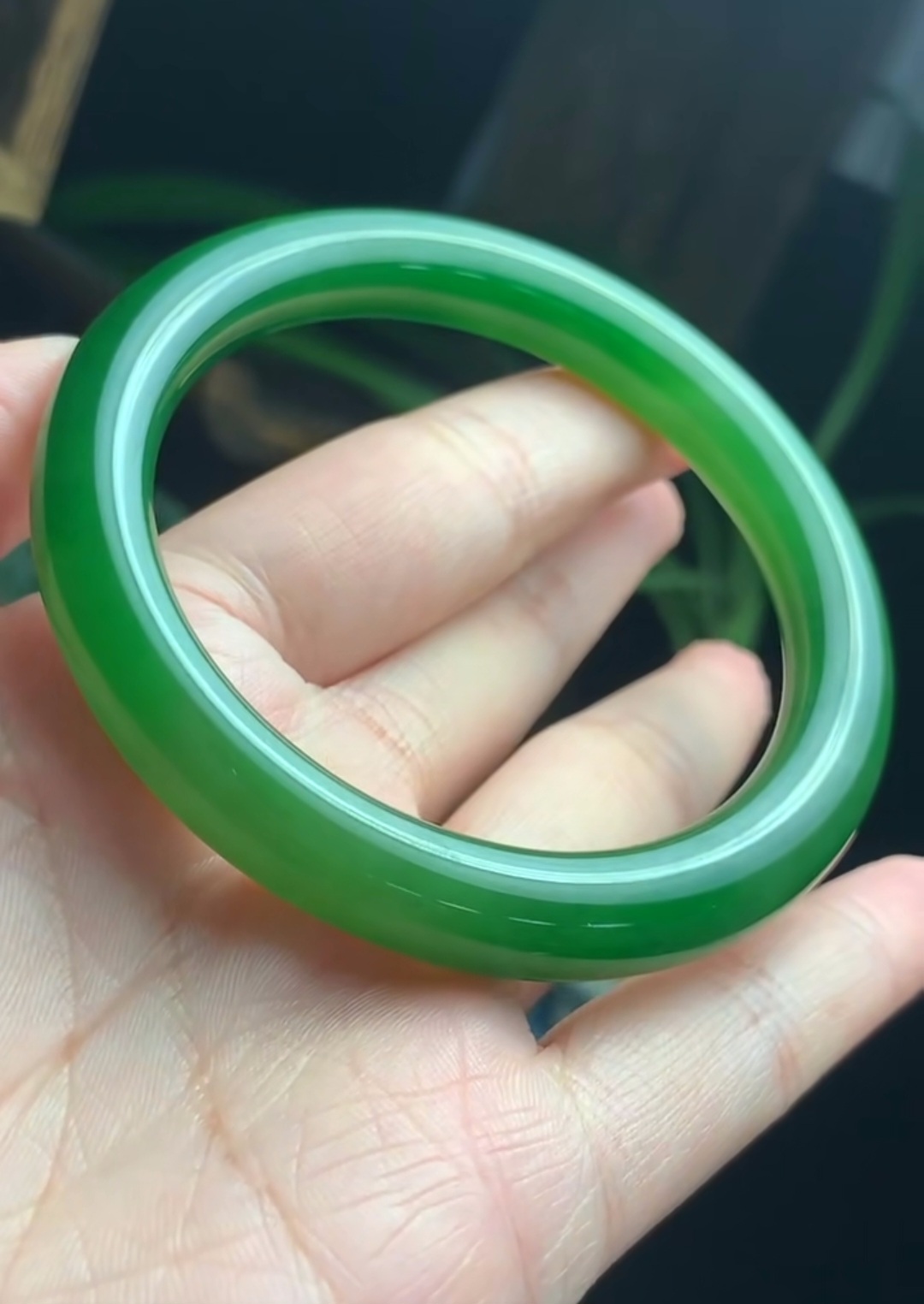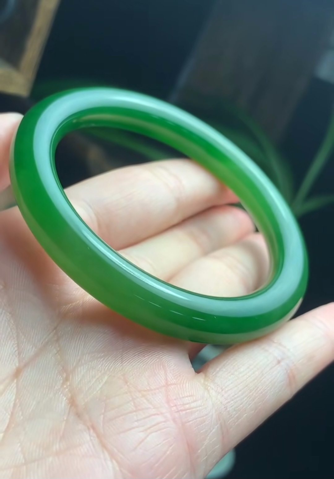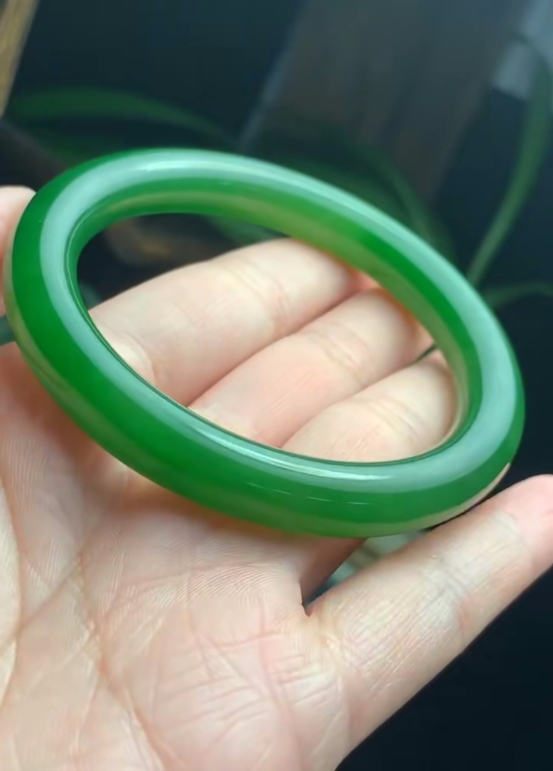 Hetian jade, jasper with a bright, icy green base, round bangle, inner diameter 57cm, width 10x10cm, weight 46g. Perfect condition with only a few small black spots. No cracks. A bright, translucent, icy green color. The material has an old-looking appearance and excellent translucency. The icy base is also very appealing.